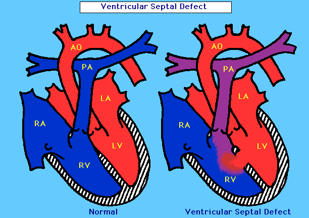 Der Ventrikelseptumdefekt (VSD) ist ein Loch in der Herzscheidewand, der mit ca. 30 % aller angeborenen Herzfehler die häufigste Fehlbildung ist. In der embryonalen Phase der Herzentwicklung wachsen die oberen und unteren Anteile der Scheidewand zwischen den Ventrikeln (Herzkammern) aufeinander zu. Ist dieses Wachstum bei der Geburt nicht ganz abgeschlossen oder vorher gestört, findet sich ein mehr oder weniger großer Defekt im muskulären oder membranösen Anteil des Ventrikelseptums. Bei komplexen Herzfehlbildungen besteht in ca. 50 % der Fälle auch ein VSD, der dann aber anders zu bewerten ist als der hier beschriebene isoliert vorliegende VSD.