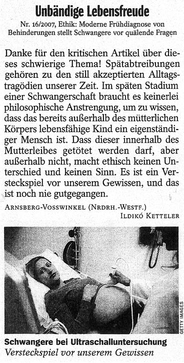 Im April 2007, schwanger mit Béla im 7.Monat, sitze ich mit dem aktuellen Spiegel in der Badewanne und stosse auf einen Artikel über dieses Thema. Es trifft mich so unglaublich, daß ich mich noch tropfend und im Bademantel vor den Computer setze und in fünf Minuten, ganz aus dem Bauch heraus, den ersten Leserbrief meines Lebens verfasse.