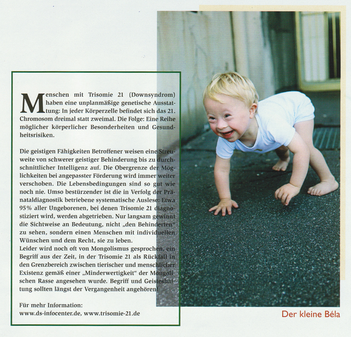 Weihnachten (2007) haben wir es endlich geschafft, Bélas Geburtsanzeige zu verschicken. Lange haben wir überlegt, wie wir unseren Freunden und Bekannten die "Besonderheiten" mitteilen sollten. Wir entschieden uns, auf der eigentlichen Geburts- und Weihnachtskarte auf jeden zusätzlichen Hinweis zu verzichten. Irgendwie wollten wir Bélas Geburt freudig bekanntgeben und nicht gleich auf einem Blatt verbinden mit dem Down-Syndrom, der Herz-OP und allen unseren Gedanken dazu, die wir aber trotzdem dringend teilen wollten.